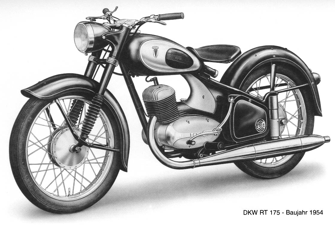 | In den fünfziger Jahren entwickelten sich 175 ccm-Motorräder zu einer der beliebtesten Hubraumklassen. DKW stieg hier 1954 mit einer völligen Neukonstruktion ein. Die Leistung des neuen Kurzhubers, der auch zur Basis der RT 200/2 wurde, erreichte nach DKW-Angaben 9,5 PS bei 5000 U/min. Die 175er hatte von Anfang an ein Viergang-Getriebe, Hinterradfederung und Vollnabenbremsen mit 150 mm Durchmesser. Die Maschine avancierte schnell zum meistverkauften Modell im DKW-Programm. Aufgrund ihrer klaren Linie und der stimmigen Proportionen ist die RT 175 unbestritten die schönste DKW, die je gebaut wurde. | ||||||||||||||||||||||||||||||||||||||||||||||||||||||||||||||||||||||||||||||||||||||||||||||||||||